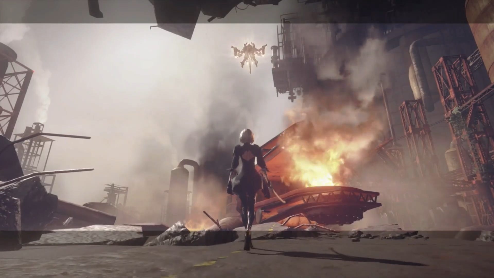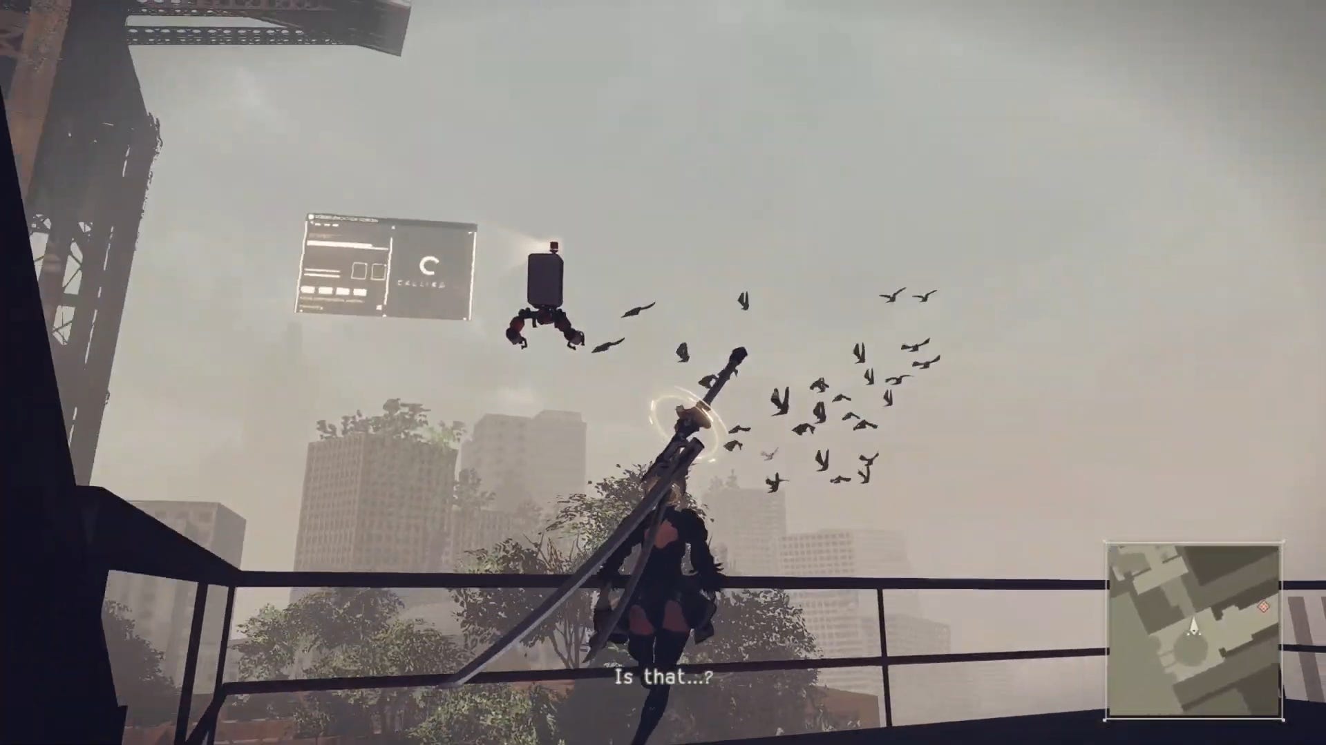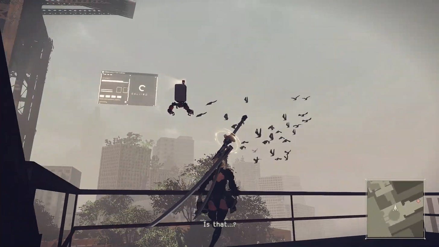 2B completely surveys the factory, finding no sign of the target. Once outside again, she notices a flock of birds flying upward, stupefied. 9S, once again, reassures her of his presence.
