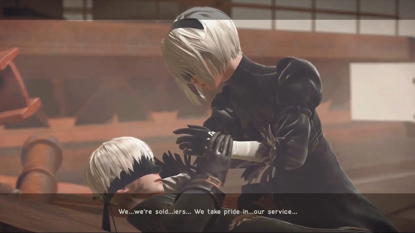 When 2B reaches 9S’s dismembered body, she immediately tells her pod to get “staunching gel” and “logic-virus vaccines.” Her pod denies the request, saying that “it’s inadvisable” and “the subject’s vital signs are too poor.” 2B lashes out and tells her pod to “Shut up!” and “Do what I say!”