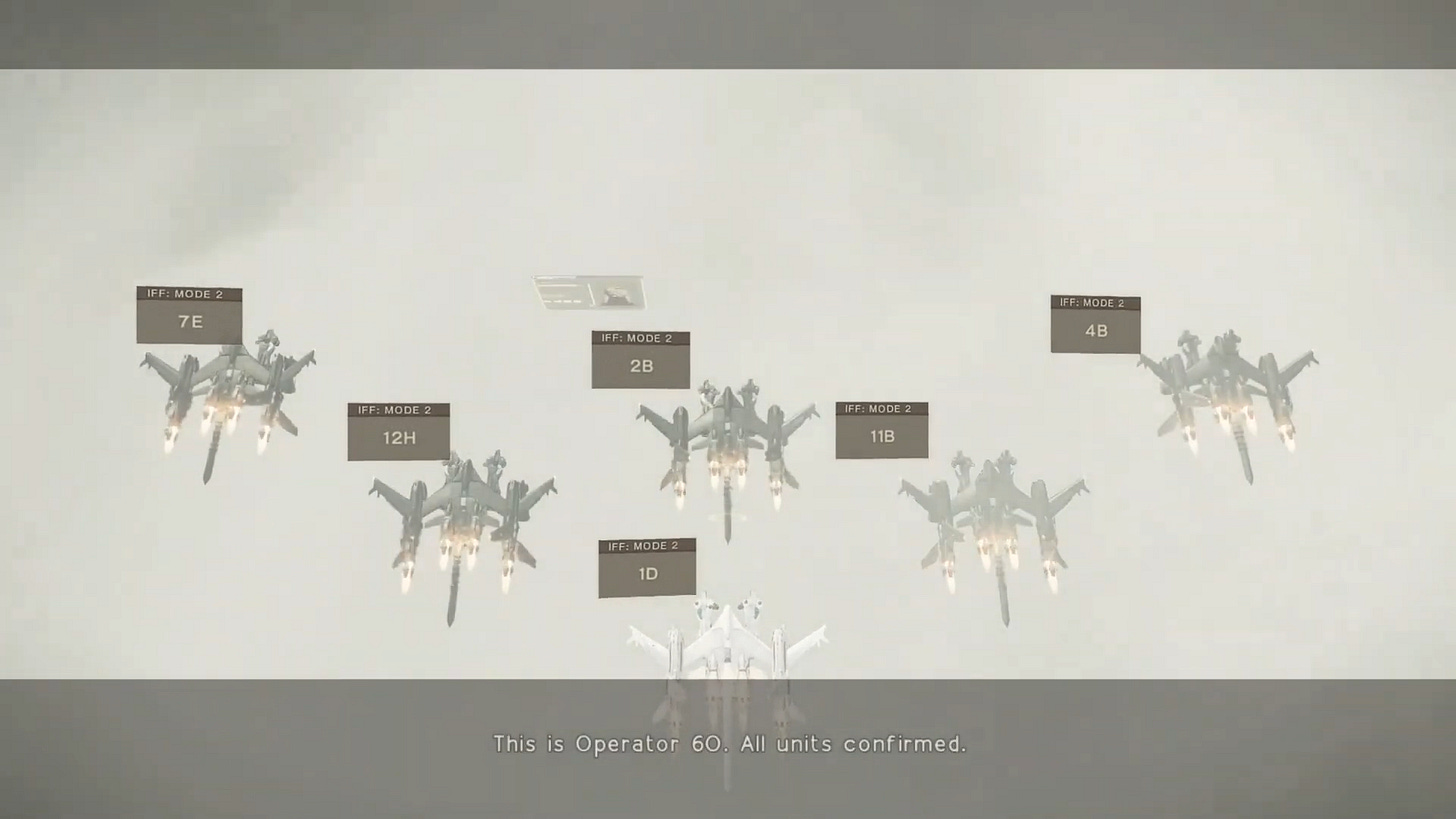 Whiteness. Fade out to an in-engine cinematic of 2B and a squad of YoRHa flight units, soaring below the stratosphere on auto-pilot. Operator 6O provides a quick debrief of the mission: fight through the machine’s anti-air defenses, destroy the Goliath-class unit, and gather any data they can.